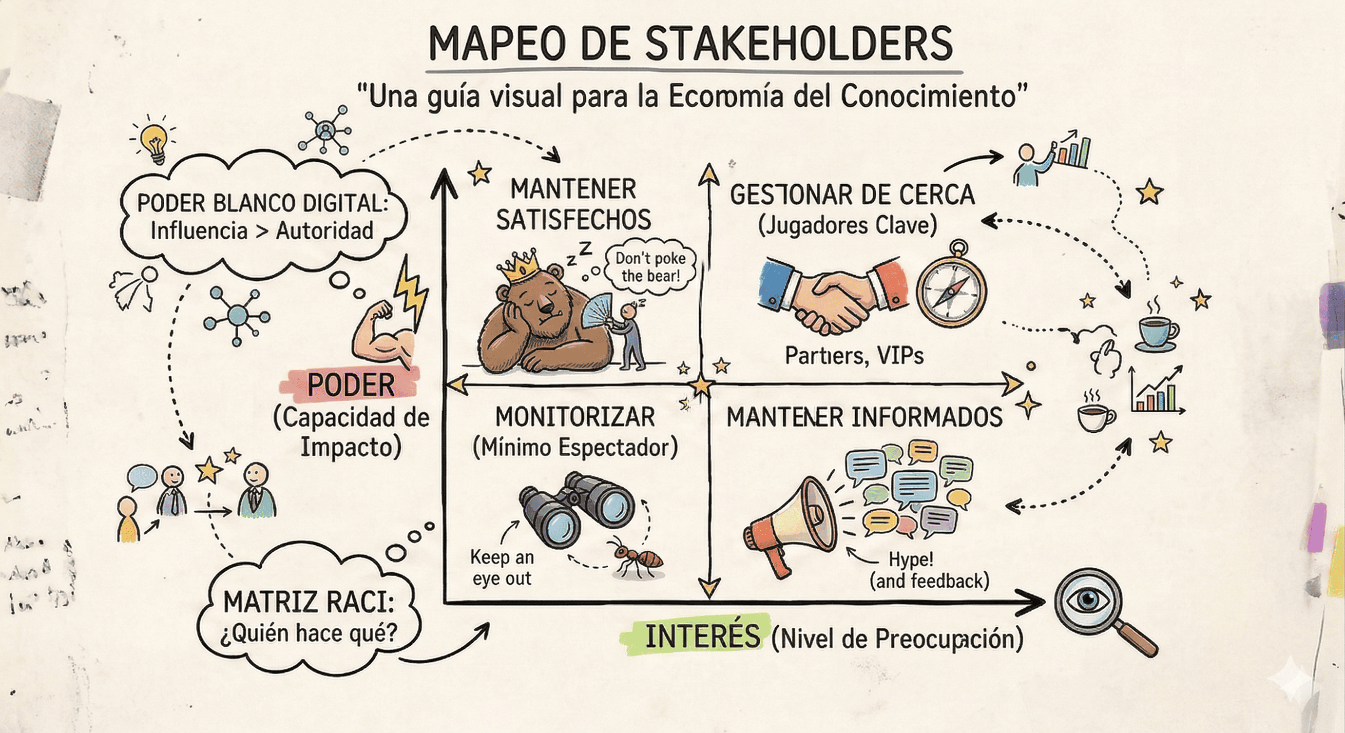 El análisis de stakeholders nos dice quién puede hacer que algo suceda… o que se detenga. Para mapear este terreno, solemos recurrir a la matriz de poder e interés. Es un cuadrante que nos obliga a clasificar a nuestros actores en cuatro categorías vitales: