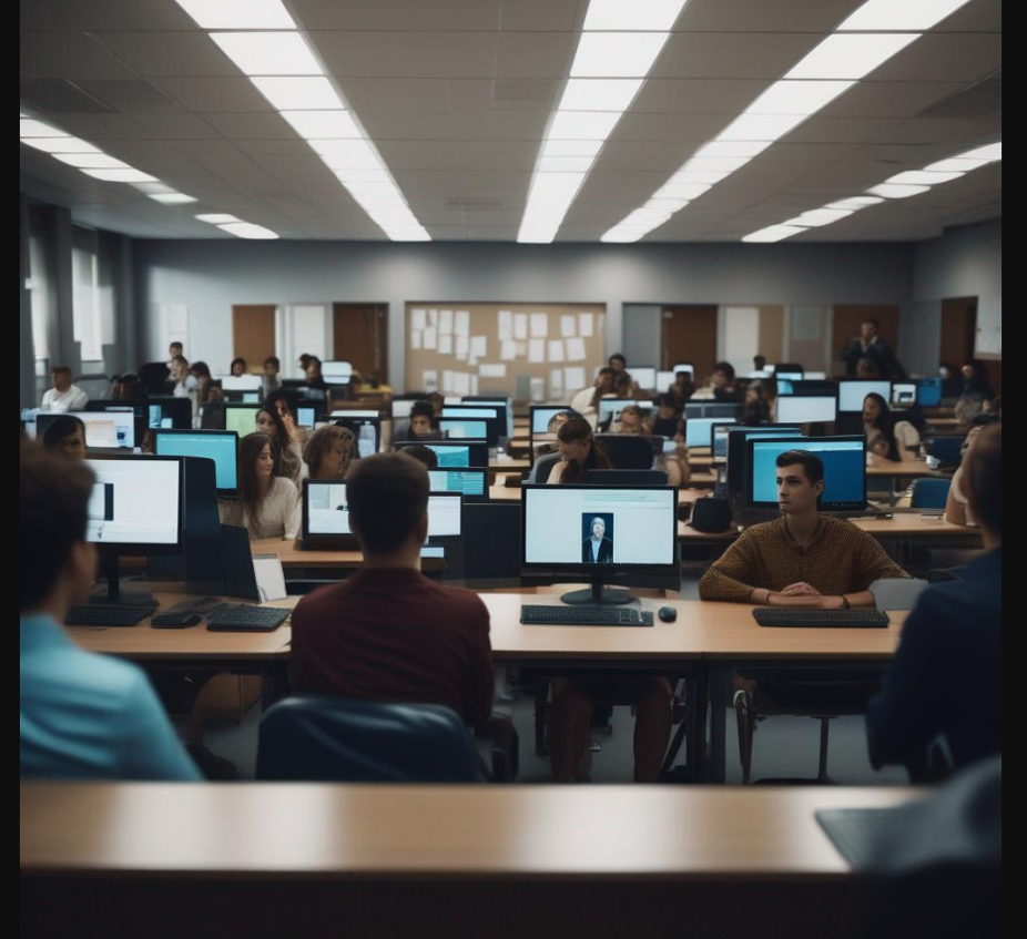 De momento, pido a Stable que me genere una imagen de estilo fotográfico de un salón de clases con personas adultas trabajando en ordenadores y móviles. Aunque le he pedido «diversidad»… mmmm… no sé… En fin, ya trabajaremos sobre esta imagen.