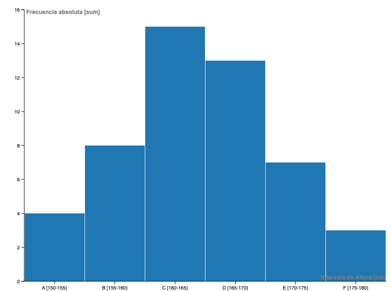 Vamos a visualizar la distribución de altura de los 50 estudiantes de un curso. Las dimensiones, en este caso, son valores continuos, puesto que corresponden a intervalos de 5 centímetros cada uno.